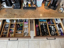 Throughout the day we shopped at booths, tried on jewelry and clothes, talked about skincare, and finished the day by attending a class on home organization. I got some great ideas about how I’d like to organize my pantry and some awesome product suggestions! In fact, my sister ordered the drawer organizers, and behold, her junk drawers are now organizational inspiration! Note that the drawer doesn’t usually hold a cat, but as she was emptying all the contents, he thought it seemed like a great place to hunker down!